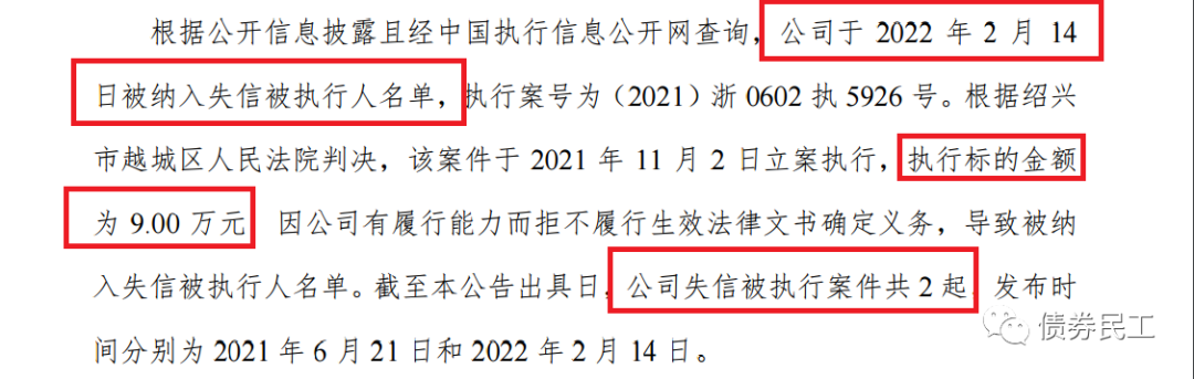 根據(jù)評級公司于2022年2月24日披露的關(guān)注公告,某城投公司因?yàn)閳?zhí)行標(biāo)的金額為9萬元的案件有履行能力而拒不履行相關(guān)義務(wù),于2022年2月14日被納入失信被執(zhí)行人名單。你沒看錯,執(zhí)行標(biāo)的金額真的是只有9萬!!!