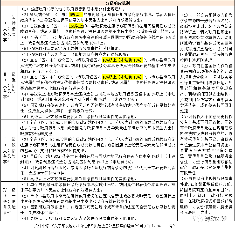 1、88號文提出,根據政府性債務風險事件的性質、影響范圍和危害程度等情況,將風險級別劃分為I級(特大)、II級(重大)、III級(較大)、IV級(一般)四個等級,實行分級響應和應急處置。