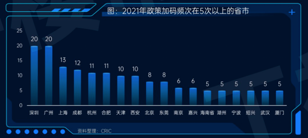 其中,深圳、廣州政策加碼多達20次,深圳重點強化信貸資金管控,并以“深房理”被查處作為政策加碼的最高峰;廣州分區域精準化調控,天河、黃埔、南沙等熱點區域依據市場實際情況,針對性地調整政策措施;上海多管齊下嚴堵政策監管漏洞,政策加碼同樣達到13次。
