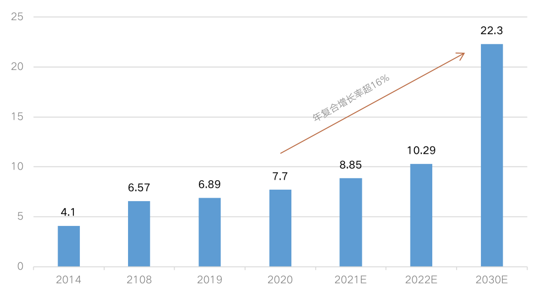 未來的10年,隨著建國后的第二代“嬰兒潮”即將步入老齡人群,養老市場將進入一個更加高速的增長階段。老年人口將是40后剛需老人、50后未富先老人群、60后邊富變老人群并存局面。預計在2030年,養老產業規模將超過22萬億元,年復合增長率將超過16%。