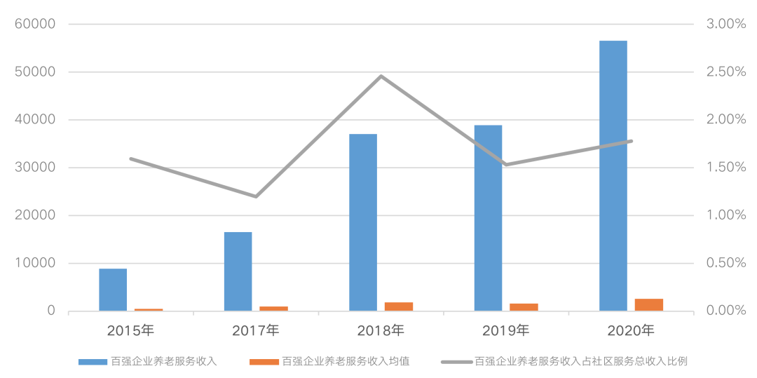 實際上,社區養老服務仍有很大的市場空間待挖掘。中物研協一組數據顯示,2020年百強企業社區養老服務收入占社區服務總收入的比例僅為1.78%,較2019年的1.53%增加0.85個百分點,社區養老服務收入正在逐步提高。