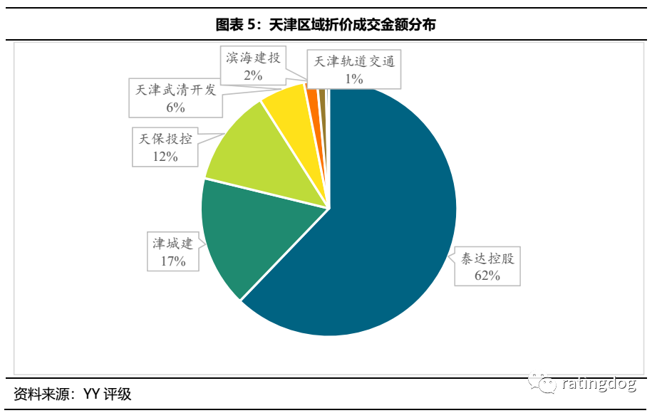 天津區域折價成交主要集中泰達控股、津城建、天保投控、天津武清開發、濱海建投、天津軌道交通、天津武清、市政投資等平臺,其中泰達控股成交金額占比最高,達62%。
