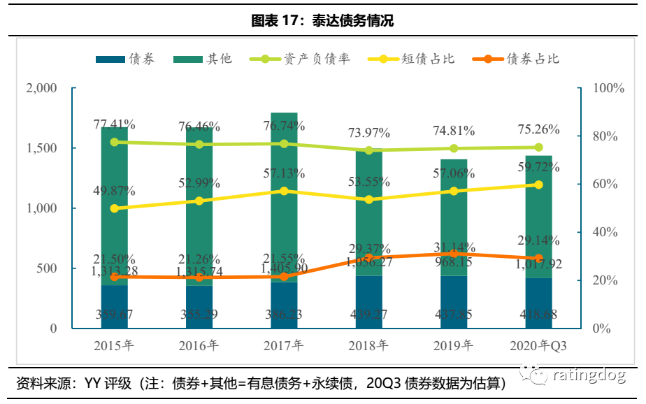 從債務來看,泰達控股負債率長期處于高位,有息債務規模龐大,品種上以銀行借款和債券為主,債券規模變動不大;債務期限結構短期化,短債占比過半,整體債務壓力很大。截至20年9月末,公司負債率75.26%,債券融資約400億元,短債占比近60%,短期滾續壓力很大。
