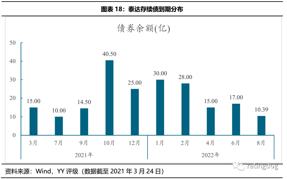 僅從泰達控股公開市場發債來看,截至21年3月24日,存續債券14只,債券余額205.39億元,均在2021-2022年到期(考慮行權),其中2021年將到期105億,占比過半。