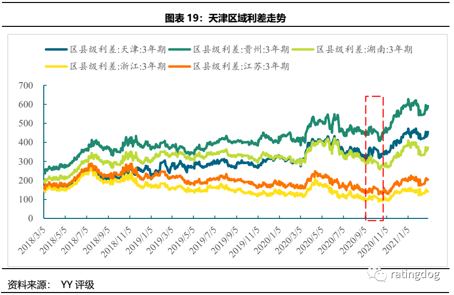 自2020年9月,天津市邀請轄內多家金融機構參與座談會,討論如何支持泰達控股以來,泰達債務問題引起市場廣泛關注,估值壓力開始顯現,出現了90元以下折價成交。從天津區縣級利差走勢來看,20年9月天津區縣級城投利差在其他區域緩慢下行時繼續走高,同期天津區縣級利差開始顯著高于湖南區縣級利差,并不斷走闊。