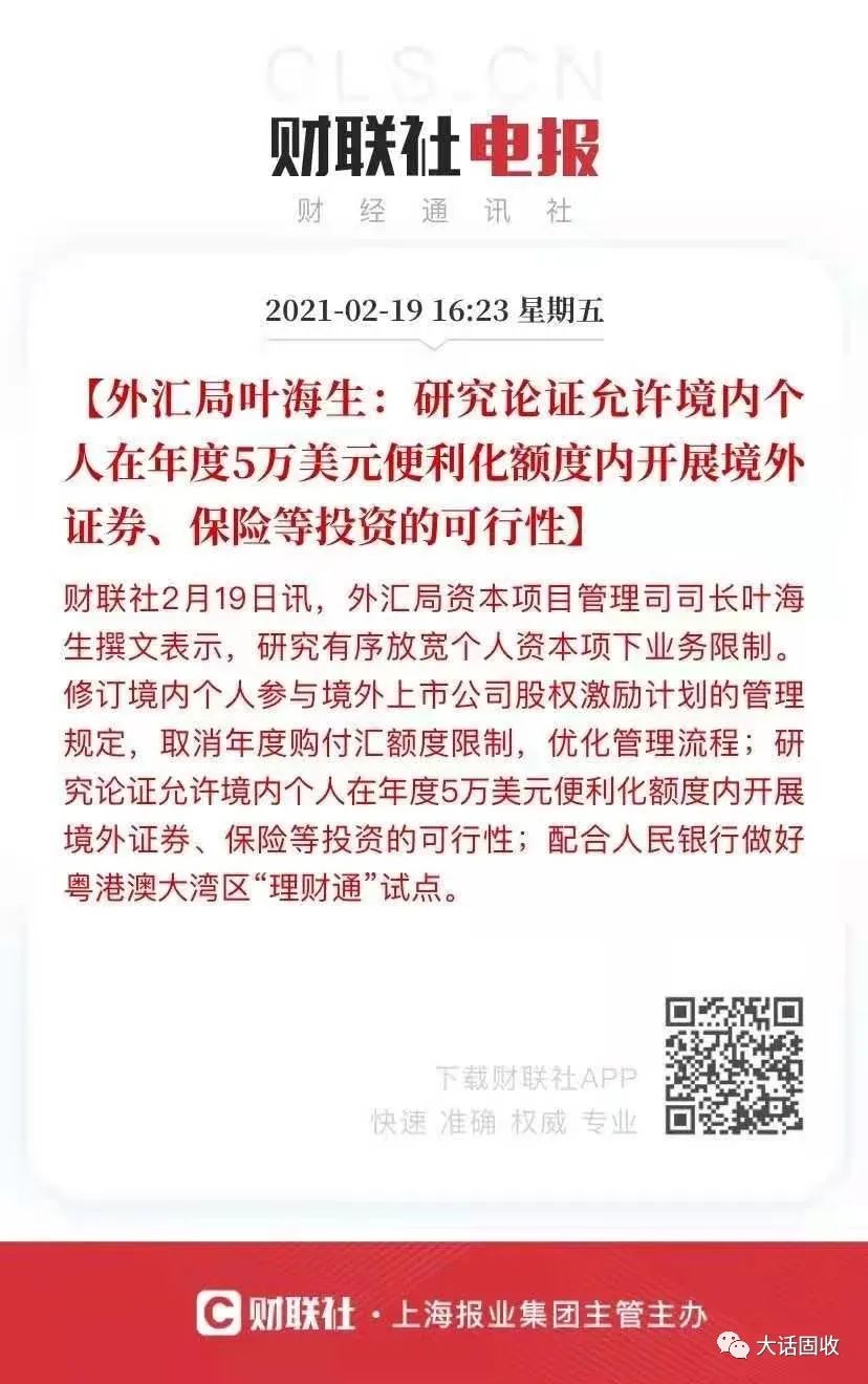 就在一小時前,又有一個比較爆炸性的信息。外匯局資本項目管理司司長葉海生表示,研究論證允許境內個人在年度5萬美元額度內開展境外證券、保險等投資的可行性。
