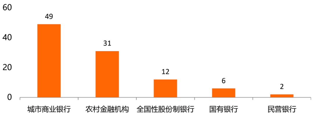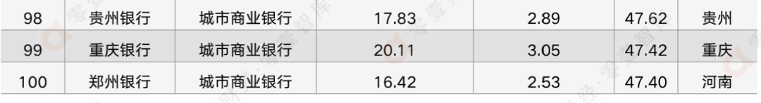 從所屬機構類型來看,在本次入選的100家銀行之中,城市商業銀行占比最高,達49%;其次為農村金融機構,占比31%;全國性股份制銀行、國有銀行、民營銀行占比分別為12%、6%、2%。