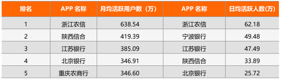 表 3:中小銀行月均月活躍用戶數、月均日活躍人數TOP 5