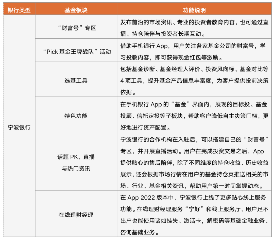 表 6:寧波銀行App(2022版)的“基金”版塊功能介紹