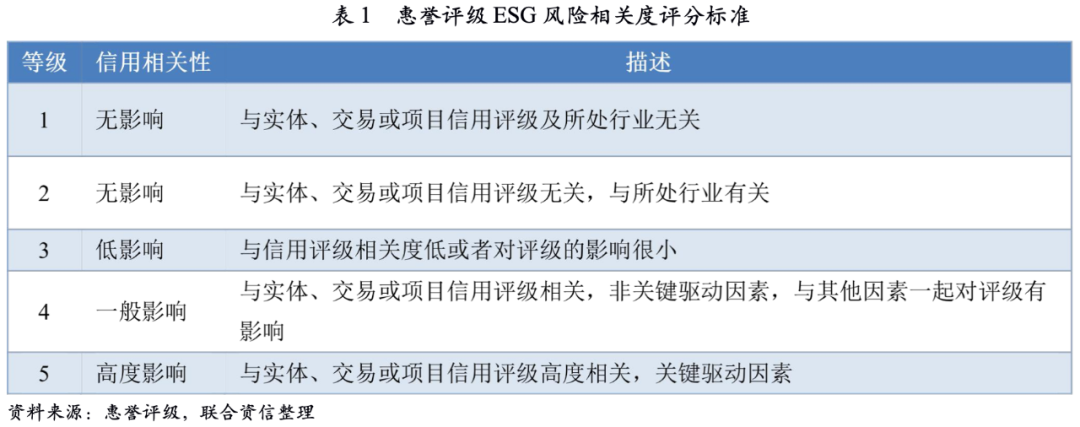 2019年1月,惠譽評級首先推出了ESG相關性模型(ESG Relevance Scores)。ESG相關性模型通過分辨不同ESG因素與信用評級的相關性來確定哪些ESG因素可以影響企業的信用水平,并最終根據信用相關性評定不同等級。惠譽評級根據市場中在環境、社會和治理方面普遍存在影響信用水平的因素歸納整理了14個相關問題,并根據不同行業調整特定的ESG風險。該ESG風險相關度評分主要分為5個等級,其中3至5等級屬于和企業信用評級相關,評分越高相關性越大,最終可能影響企業的信用評級變化。