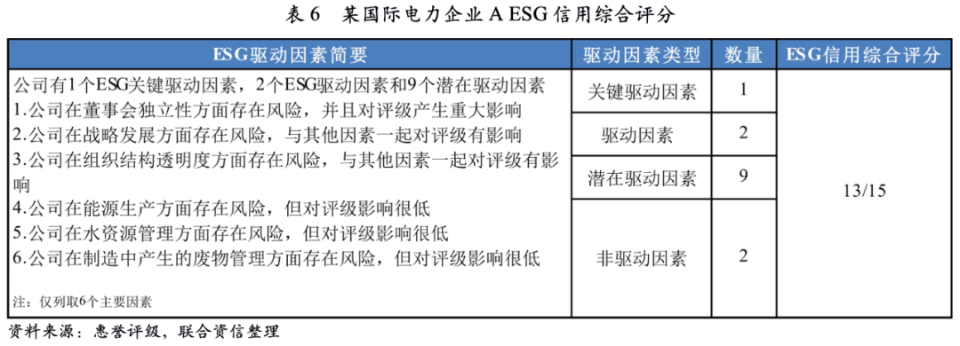 惠譽評級結合環境、社會和公司治理三大方面對某國際電力企業A進行風險評估,綜合匯總了ESG對企業A信用評級驅動因素并通過各個驅動因素數量得出ESG信用綜合評分。該ESG信用綜合評分表明ESG風險對企業A信用水平有很大影響,其中公司治理問題和信用評級關聯度最大,未來需重點關注。
