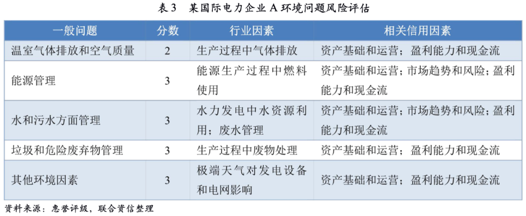 以某國際電力企業A為例,該電力企業涉及環境(E)方面一般問題有五個,分別為溫室氣體排放和空氣質量、能源管理、水和污水方面管理、垃圾和危險廢棄物管理以及其他環境因素。在該公司所處的特定行業下,公司涉及環境方面因素相關度評分主要集中于分數3(如表3所示),即環境方面的問題與該公司信用評級相關度低,對企業信用評級的影響很小。比如對水和污水管理方面評分,主要考慮了公司在水力發電中水資源利用和廢水管理,該因素是公司ESG潛在評級因素,可能對公司資產基礎運營、盈利能力和現金流等相關信用因素產生一定影響。