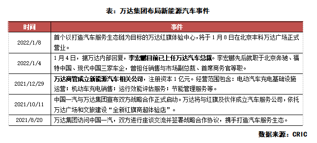 值得注意的是,2021年12月29日,萬達商管也成立了新能源汽車相關公司。萬達參與新能源汽車行業,走了一條不同的路。萬達既不像大多數房企進行財務投資,也不像少數房企直接造車,而是延續了自身的輕資產理念,把上游造車及研發等高投入的環節交給合作車企(中國一汽),自己參與新能源汽車產業鏈中汽車銷售這一“資產較輕”的一環。