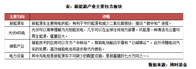 新能源指的是傳統能源之外的各種能源形式,而針對新能源的開發及應用形成了新能源產業。目前我國的新能源產業方向主要包括,新能源車、光伏&風電、儲能產業、電力設備四個方面。