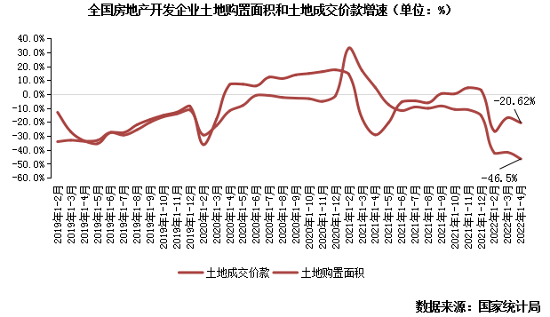 據國家統計局數據:1-4月,房地產開發企業土地購置面積1766萬平方米,同比下降46.5%;土地成交價款955億元,下降20.6%;二者降幅均較1-3月有所擴大。單月來看,4月土地購置面積和土地成交價款分別為427萬平方米和283億元,同比下降57%和28%。