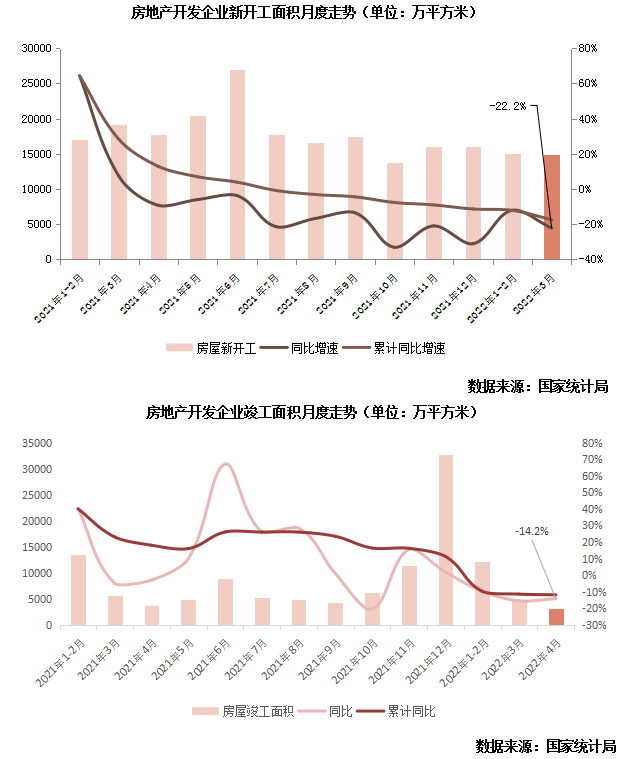 單月來看,4月房地產開發企業房屋施工、新開工和竣工面積分別為12329萬平方米、9901萬平方米和3101萬平方米,同比分別下降38.7%、44.2%和14.2%。