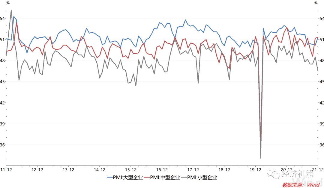 2)大型企業景氣度提升,小型企業景氣度放緩顯著。12月,大中小型企業依舊呈分化態勢,與11月不同的是,12月大型企業恢復較好,小型企業景氣度惡化。其中,大型企業PMI為51.3%,較上月提升1.1個百分點;中型企業PMI與上月基本持平,維持在擴張區間;小型企業PMI為46.5%,較上月回落2個百分點(圖2)。這表明,在疫情反復的當下,中小企業仍面臨極大經營困境,需要在政策上提供更有力的支持,這與12月中旬國常會繼續部署加大中小微企業支持力度是一致的。