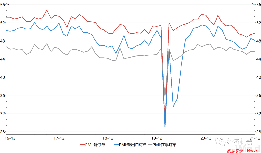 4)新訂單繼續改善,在手訂單出現回落。12月,PMI新訂單指數為49.7%,較上月回升0.3個百分點,繼續改善。其中,新出口訂單為48.1%,較上月回落0.4個百分點,說明國內新訂單改善會更強一些。在手訂單指數45.6%,較上月回落0.1個百分點。這可能是由于生產的逐步正常化,積壓的訂單已經逐步消化完成,但也從一定上說明新訂單增長并不強勁(圖5)。