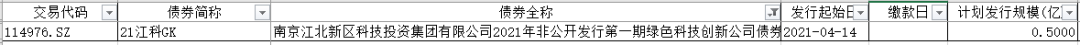 2、通過私募公司債券發(fā)行的碳中和債共1只,債券發(fā)行規(guī)模為0.50億元,發(fā)行人為南京江北新區(qū)科技投資集團有限公司。