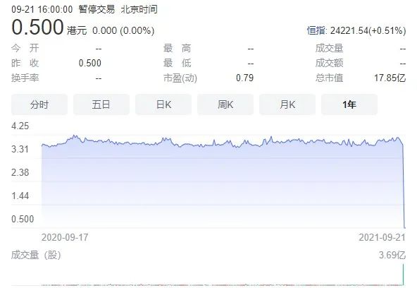 跌得實在是不行了,最低曾至0.37港元/股,跌幅超90%,最終以發布“短暫停牌”公告暫時緩解。