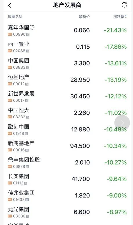 此前,中國基金報整理了,香港本地地產股集體大跌。恒基地產、新世界發展、嘉里建設跌超10%,長實集團、新鴻基地產跌超9%,龍光集團、綠景中國地產、富力地產跌超8%,雅居樂跌超7%。