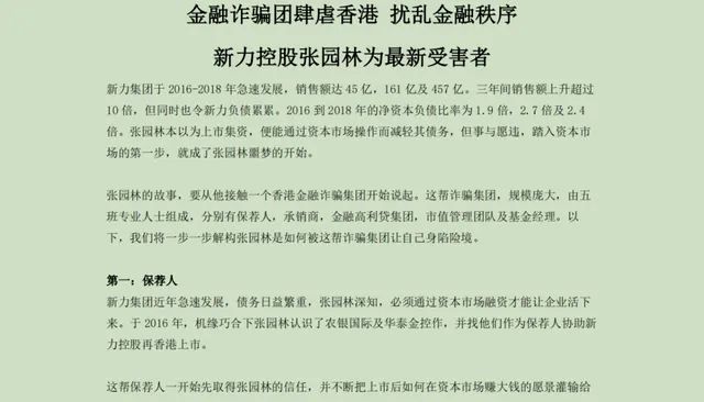 文件內容顯示,新力董事長張園林身陷金融騙局,其在推動公司上市及上市之后的數筆融資中被一個境外金融高利貸集團設下圈套,成為金融詐騙集團的受害者。