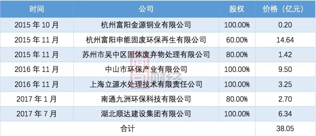 2015年,公司收購了金源銅業、申能環保、吳中固廢三家危廢處理企業;2016年,收購專注小城鎮污水處理的中山環保以及上海立源水處理技術有限責任公司;2017年,并購再加碼,收購南通環保、湖北順達建設等多家公司。