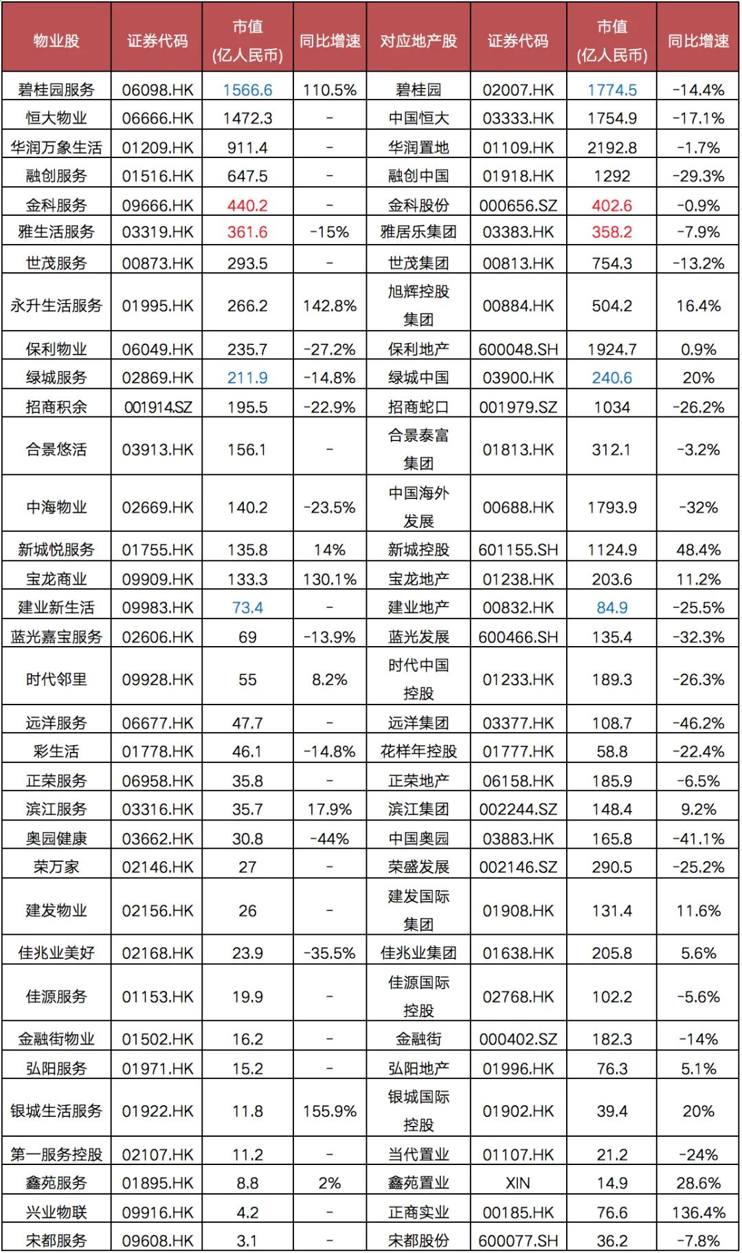 45家企業中,有34家擁有在A股或H股上市的地產公司背景。與地產股市值整體下滑不同,物業股市值正呈現快速上漲的趨勢,未來不排除會有部分物業股將接近或反超地產股。