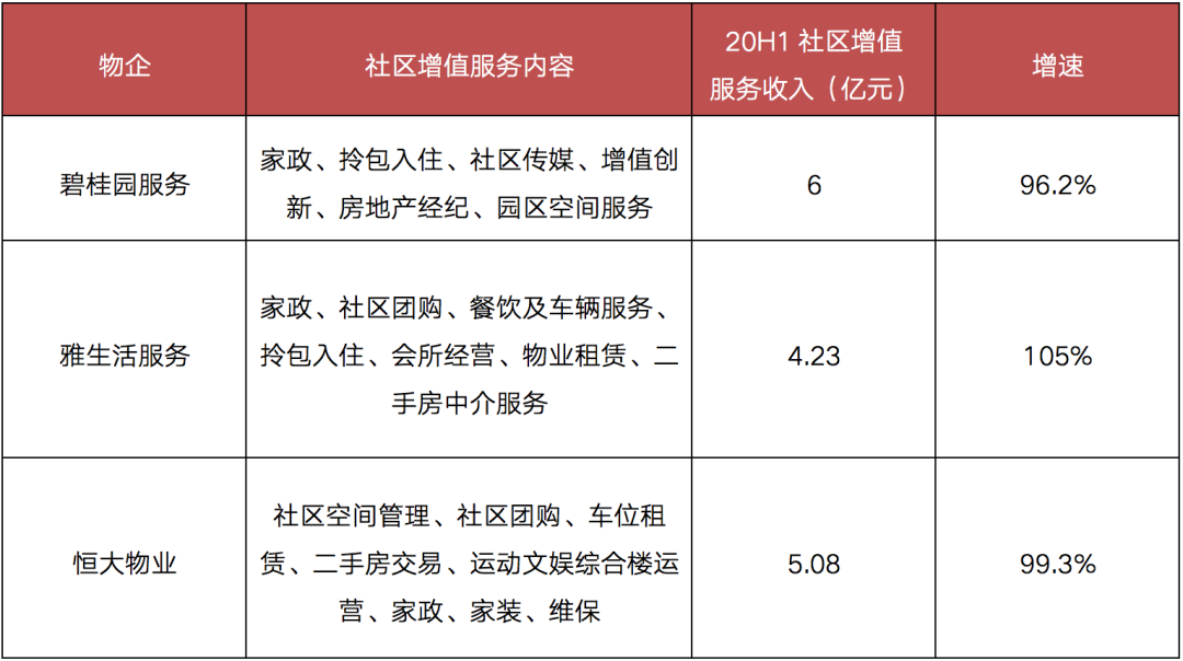 表:20H1部分龍頭物企社區增值服務內容及收入情況