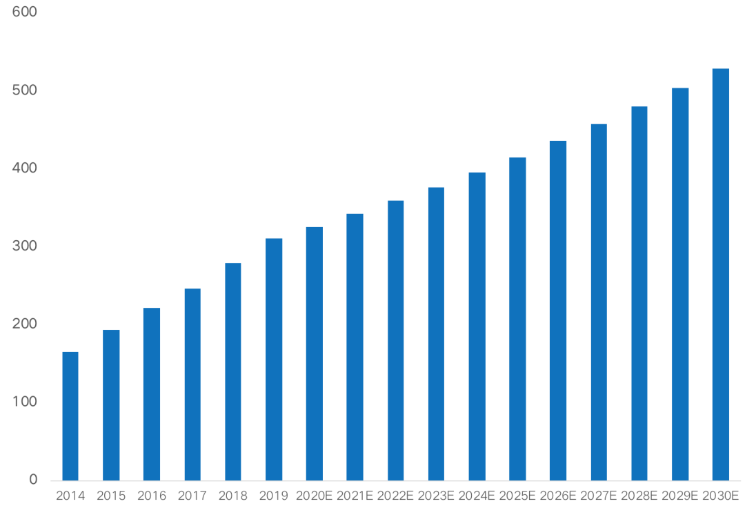 隨著房地產逐步進入“無增長”時代,物業管理行業仍保持快速發展。根據克而瑞物管研究,國內物業管理行業管理面積持續走高,2020年行業管理規模超過300億平方米,近5年復合增長率超11%。綜合考慮考慮現有存量物業覆蓋率提升、房地產開發增量、非房地產開發物業增量以及城市服務、鄉鎮治理等領域的發展,預計2030年我國物業管理行業管理規模或接近500億平方米。按照500強物業服務企業平均物業費3.09元/平米·月,并考慮一定的物業費價格增長,預計2030年基礎物業服務市場規模將超過2萬億。