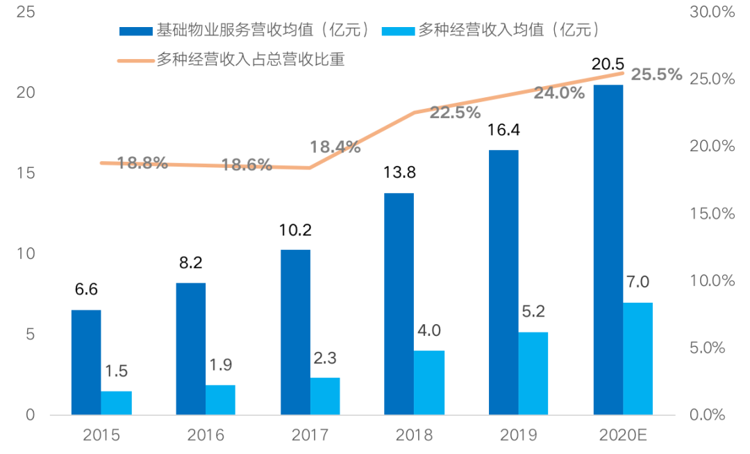 圖:2015-2020年(預估)百強物業服務企業營收結構及占比