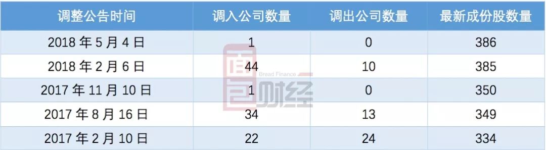 從2017年開始,恒生指數開始公布對恒生港股通指數的季度檢討結果,至今已進行過5次調整,共調入公司102家,調出公司47家,截至2018年5月4日,成份股數量為386只。