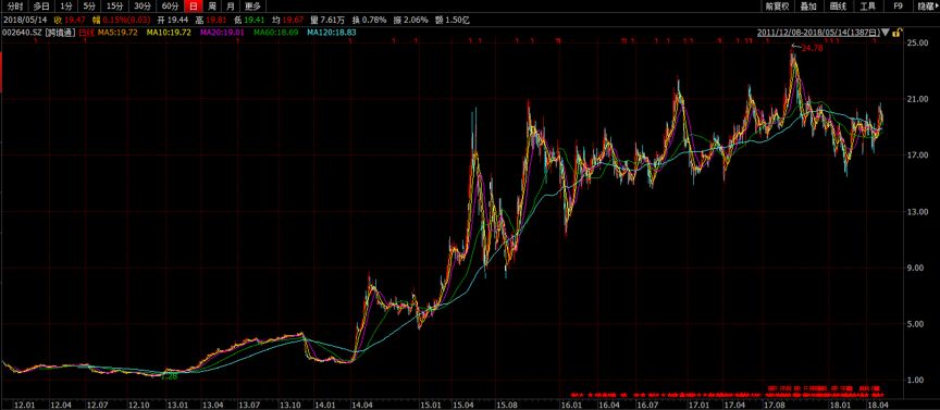 這一系列并購拉動了公司業(yè)績的持續(xù)上升,自2014至2017年,公司歸母凈利潤由0.33億元增至7.51億元,累計增幅達(dá)到2175.76%。而隨著業(yè)績增長,公司的股價也是一路上揚(yáng)。