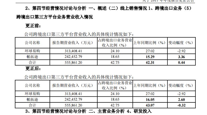 對比兩份報告發(fā)現(xiàn),公司對原財報關(guān)于經(jīng)營情況討論與分析、合并利潤表和重要會計政策及會計估計中的存貨跌價準(zhǔn)備政策三個部分中合計5處內(nèi)容進(jìn)行了更正。更正的內(nèi)容主要涉及公司各跨境出口平臺收入占營收比例、研發(fā)投入變動比例等。簡單截幾張圖感受下: