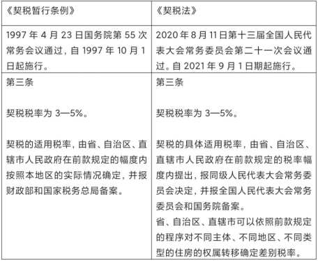 通過(guò)對(duì)比《契稅暫行條例》與《契稅法》,你會(huì)發(fā)現(xiàn),其實(shí)我國(guó)契稅一直以來(lái)適用的稅率都是3—5%。契稅立法后,并沒(méi)有調(diào)整法定稅率的幅度。