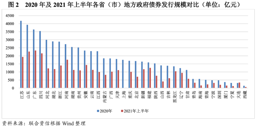 各省市發(fā)行規(guī)模分化明顯。從發(fā)行區(qū)域的分布情況看,2021年上半年,除上海市未發(fā)行政府債券以外,其余全國(guó)30個(gè)省級(jí)行政區(qū)、5個(gè)計(jì)劃單列市和新疆生產(chǎn)建設(shè)兵團(tuán)均有地方政府債券發(fā)行,但各省市發(fā)行規(guī)模分化較為明顯。整體看,除福建省、新疆維吾爾自治區(qū)(含生產(chǎn)建設(shè)兵團(tuán))和大連市的發(fā)行規(guī)模相對(duì)排名較2020年全年上升較多,其余各省(市、自治區(qū))發(fā)行規(guī)模的相對(duì)排名與2020年較為接近,發(fā)行規(guī)模前三名的地區(qū)為廣東省、山東省和四川省,大連市發(fā)行規(guī)模已超過(guò)了2020年全年,近半數(shù)地區(qū)累計(jì)發(fā)行規(guī)模超過(guò)2020年全年的50%以上,山西省和海南省發(fā)行規(guī)模不足2020年全年的30%。從凈融資額來(lái)看,除上海市凈融資額為負(fù)以外,其余省(市、自治區(qū))2021年上半年凈融資額均為正,其中超過(guò)千億的區(qū)域有山東省(不含青島市)、四川省、廣東省(不含深圳市)、安徽省、河南省和江蘇省。