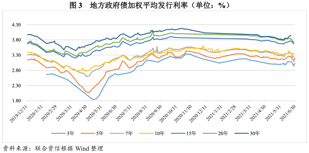 發(fā)行利率整體呈小幅下降走勢(shì),期限利差同比有所收斂。發(fā)行利率方面,2021年上半年,央行繼續(xù)實(shí)施穩(wěn)健的貨幣政策,綜合運(yùn)用多種貨幣政策工具,通過(guò)公開(kāi)市場(chǎng)操作、中期借貸便利(MLF)、定向中期借貸便利(TMLF)、常備借貸便利(SLF)以及央行票據(jù)互換等工具,合理安排工具搭配和操作節(jié)奏,維持市場(chǎng)流動(dòng)性的合理充裕。在寬松適度的貨幣政策背景下,2021年上半年地方政府債券發(fā)行利率整體呈小幅下降走勢(shì)。一季度,地方政府債發(fā)行利率呈先降后升走勢(shì)(長(zhǎng)期限地方政府債券發(fā)行利率相對(duì)穩(wěn)定主要系發(fā)行較少導(dǎo)致樣本少所致),7年和10年期地方政府債的發(fā)行利率較為接近。二季度,各期限地方政府債券的發(fā)行利率波動(dòng)均較大,6月底,10年及以下期限地方政府債券發(fā)行利率有所回升,15年及20年地方政府債券發(fā)行利率有所回落。