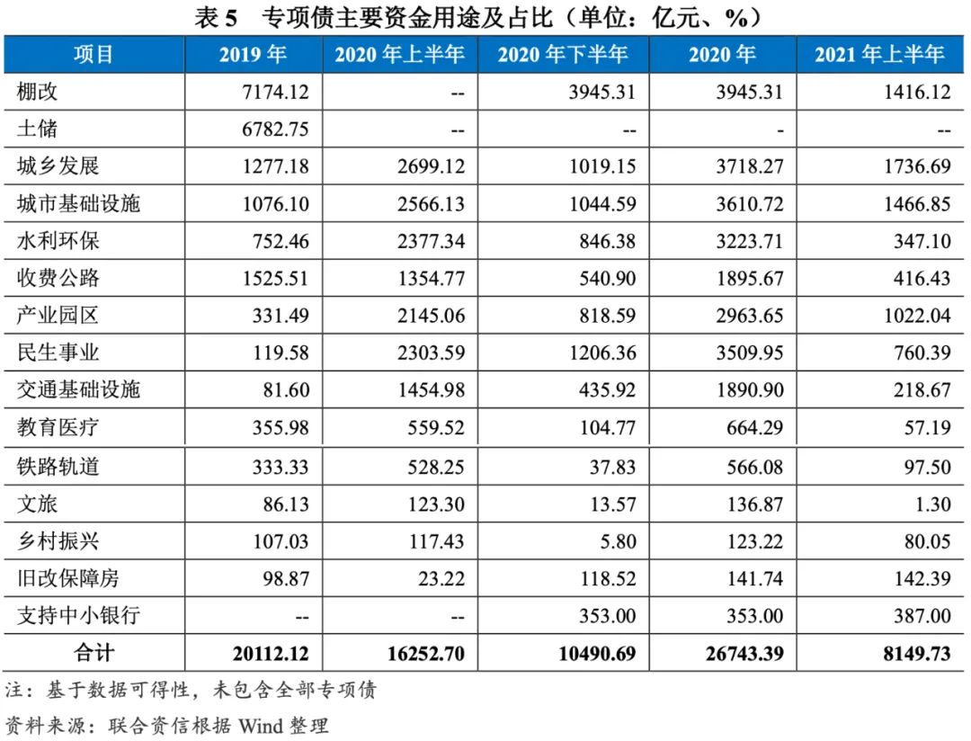 2021年上半年,專項(xiàng)債募集資金主要投向結(jié)構(gòu)較2020年全年變化不大,仍以基建類項(xiàng)目為主。同時(shí),2021年上半年已有387.00億元專項(xiàng)債用于支持中小銀行發(fā)展,發(fā)行規(guī)模已超過(guò)2020年全年。2021年上半年,新增專項(xiàng)債發(fā)行速度放緩,其中用于水利環(huán)保、收費(fèi)公路、民生事業(yè)、教育醫(yī)療、鐵路軌道等方向的專項(xiàng)債發(fā)行規(guī)模不足2020年全年發(fā)行規(guī)模的30%。2021年上半年,用于棚戶區(qū)改造的專項(xiàng)債規(guī)模占到當(dāng)期項(xiàng)目收益類專項(xiàng)債的17.38%,上年同期無(wú)棚改專項(xiàng)債發(fā)行。