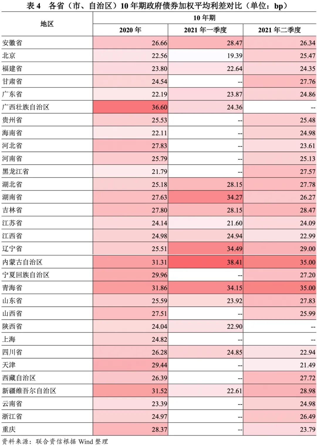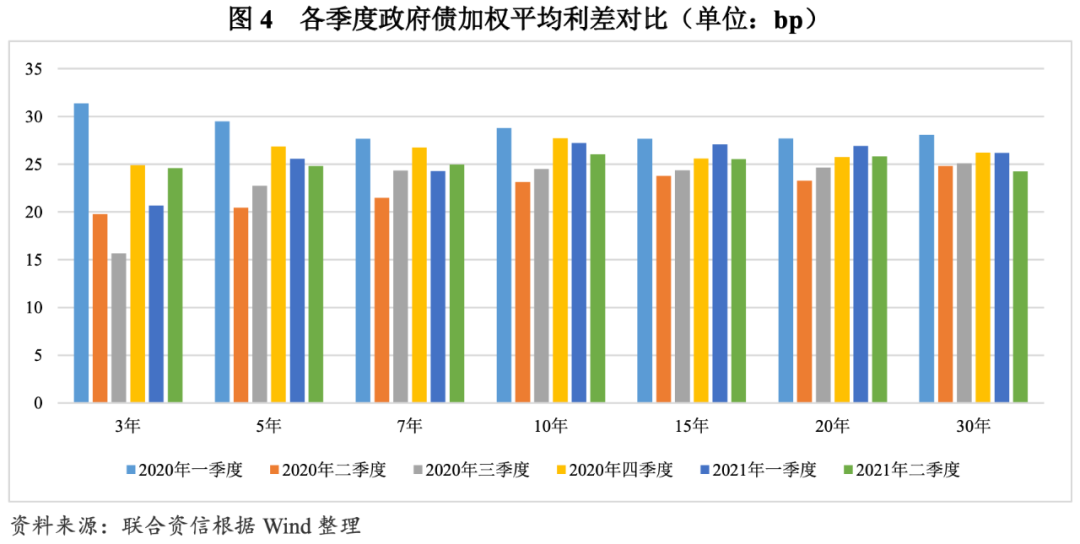 發(fā)行利差走勢(shì)有所分化,中長(zhǎng)期品種的區(qū)域利差有所擴(kuò)大。發(fā)行利差方面,以同期限中債國(guó)債到期收益率為基準(zhǔn),2021年一季度,10年及以下期限政府債券加權(quán)平均利差環(huán)比均有所下降,15年及以上期限政府債券加權(quán)平均利差環(huán)比有所上升或保持相對(duì)穩(wěn)定;2021年二季度,除3年和7年政府債券外,其他期限政府債券加權(quán)平均利差環(huán)比均有所下降。分區(qū)域看,2020年以來(lái),青海省和內(nèi)蒙古自治區(qū)發(fā)行的中長(zhǎng)期品種利差顯著高于其他區(qū)域;一季度,區(qū)域分化較上年度明顯走闊;二季度,中長(zhǎng)期品種的區(qū)域利差有所收斂。與2020年相比,有近一半省(市、自治區(qū))2021年二季度政府債券發(fā)行利差有所下降,其中天津市、重慶市和河北省發(fā)行利差降幅均超過(guò)4bp,天津市最高為7.95bp;黑龍江省、內(nèi)蒙古自治區(qū)、遼寧省、甘肅省和青海省發(fā)行利差增幅超過(guò)3bp。
