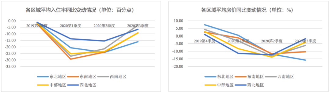 從區域看,臨近省份受疫情影響程度大體相同,將全國分為東北、東南、西南、西北和中部共五個區域選取了五組標的省份,一二季度各區域酒店業均受疫情影響較大,自三季度起,酒店業雖陸續開始復蘇但各區域恢復情況受當地經濟影響有所差異:2020年發展較快的中部地區、西北地區和西南地區酒店業恢復較好,其中近年來GDP增速最快的西北地區酒店業恢復程度好;東南地區因部分沿海城市對外貿易往來較多、海外疫情未有好轉,致使當地酒店業恢復弱于中部地區和西南地區;東北地區近年來GDP增長較慢,當地酒店業恢復程度弱。整體看,第三季度國內因疫情得到控制商務出行逐漸恢復,使得經濟發展較快區域的酒店經營向好,部分對外依賴程度較高的城市或地區的酒店業恢復情況較弱,但所受影響有限。