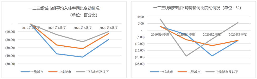 從不同等級城市組看,一二三線城市組酒店業在上半年均受疫情影響嚴重,三季度均有所好轉,但不同等級城市組恢復情況有所不同。其中,一二季度房價和入住率下跌幅度從小到大為三線城市組、二線城市組和一線城市組,三線城市組酒店業受損相對較?。欢径染频陿I恢復程度由好到弱同為三線城市組、二線城市組和一線城市組。整體看,三線城市酒店業受疫情影響相對較小、恢復較快;而一二線城市酒店客源因全球疫情影響海外客源大幅減少并尚未完全恢復,且一二線城市管控更嚴,酒店業恢復程度較慢。