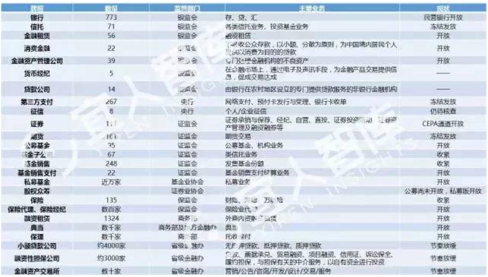 目前,我國的金融牌照由 “一行三會”及其他監(jiān)管部門發(fā)出,即“央行、銀監(jiān)會、證監(jiān)會、保監(jiān)會”,由于銀監(jiān)會和保監(jiān)會合并為銀保監(jiān)會,現(xiàn)在應(yīng)該是“一行兩會”了。金融監(jiān)管根據(jù)時段劃分為事前監(jiān)管、事中監(jiān)管、事后監(jiān)管,市場準(zhǔn)入制度是事前監(jiān)管的核心,金融許可證則是市場準(zhǔn)入制度的常態(tài)表現(xiàn)。目前金融牌照主要分布在銀行、證券、期貨、保險、基金、信托、租賃七個領(lǐng)域中。