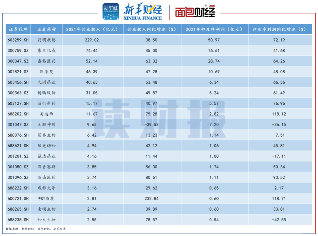 統(tǒng)計(jì)顯示,18家醫(yī)療研發(fā)外包企業(yè)2021年合計(jì)實(shí)現(xiàn)營(yíng)收544.53億元、歸母凈利潤(rùn)142.64億元。這些企業(yè)營(yíng)業(yè)收入、歸母凈利潤(rùn)的同比增速中位數(shù)分別為46.14%和49.21%。