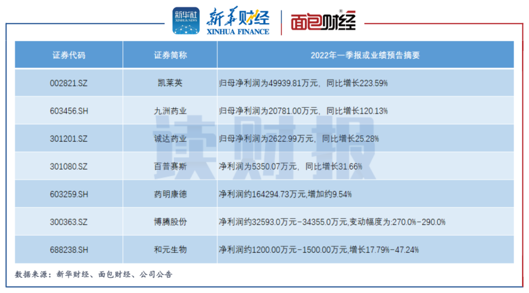 凱萊英、九州藥業(yè)、博騰股份業(yè)績(jī)?cè)鲩L(zhǎng)較快,2022年一季度的歸母凈利潤(rùn)均同比上漲超過(guò)1倍。