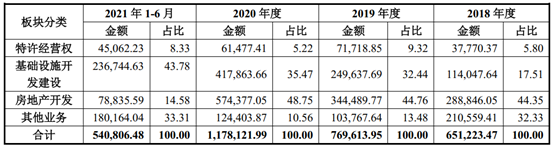 近三年特許經營權業務收入分別為37,770.37萬元、71,718.85萬元和61,477.41萬元,占營業收入的比例分別為5.80%、9.32%和5.22%;近三年基礎設施開發建設業務收入分別為114,047.64萬元、249,637.69萬元和417,863.66萬元,占營業收入的比例分別為17.51%、32.44%和35.47%。