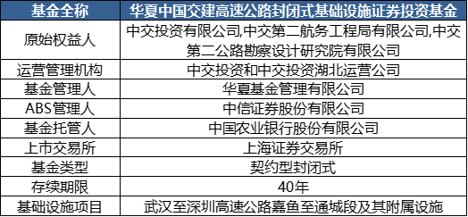 2022年4月8日,中國交通建設集團有限公司(以下簡稱中國交建)作為發起人的基礎設施公募REITs項目,即“華夏中國交建高速公路封閉式基礎設施證券投資基金”順利完成發行,基金最終募集規模為93.99億元。中信證券擔任專項計劃管理人,華夏基金擔任公募基金管理人。