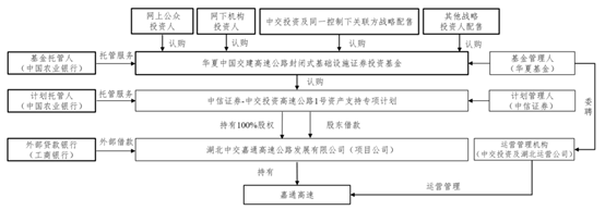 本基金的基金管理人為華夏基金管理有限公司,資產支持證券管理人為中信證券股份有限公司,本基金的托管人為中國農業銀行股份有限公司?;鸸芾砣似刚堉薪煌顿Y有限公司及中交投資湖北運營公司為運營管理機構,提供運營管理服務。上述基礎設施基金的整體架構符合《公開募集基礎設施證券投資基金指引(試行)》的規定。