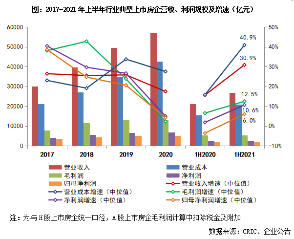 具體來看,2021年上半年行業(yè)80家典型上市房企1整體實現(xiàn)營收收入26839億元、營業(yè)成本21039億元,營收和營業(yè)成本的增速中位值分別為30.9%和40.9%。雖然從數(shù)值上看,營收增幅較去年同期有明顯回升且處在歷年較高水平,但這主要是因為2020年上半年受疫情影響,項目竣工及交付結(jié)轉(zhuǎn)普遍延遲、收入無法如期確認(rèn)、上半年整體結(jié)算基數(shù)較低。