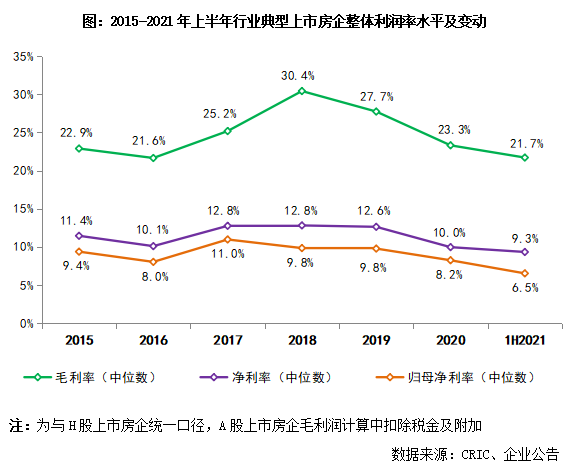 2021年上半年,行業(yè)營收增速較去年疫情影響下的低位有所回升,但利潤增速明顯低于營收增速且處在歷年來的較低水平。這主要是因為前期高地價項目和資本化利息步入結(jié)算,推高營業(yè)成本、企業(yè)整體利潤空間繼續(xù)承壓。上半年,行業(yè)整體的利潤率指標(biāo)已降至2015年以來的歷史最低水平,近半數(shù)典型房企毛利率、歸母凈利率雙降。