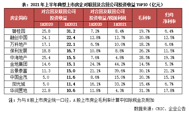 2021年上半年80家典型上市房企中,近半數(shù)房企合營聯(lián)營收入占稅前利潤的比重較上年同期呈現(xiàn)不同程度的上升,行業(yè)合作加深。而從對聯(lián)營及合營投資收益的絕對規(guī)模來看,上半年典型上市房企中25家房企實現(xiàn)同比增長,其中13家房企增幅超過100%,包括首創(chuàng)置業(yè)、越秀地產(chǎn)、招商蛇口等。龍頭房企的規(guī)模優(yōu)勢顯著,碧桂園以31.2億元的合聯(lián)營收益位列榜首,較上年同期增長20.9%,融創(chuàng)、萬科、保利等房企也依舊位居前列。